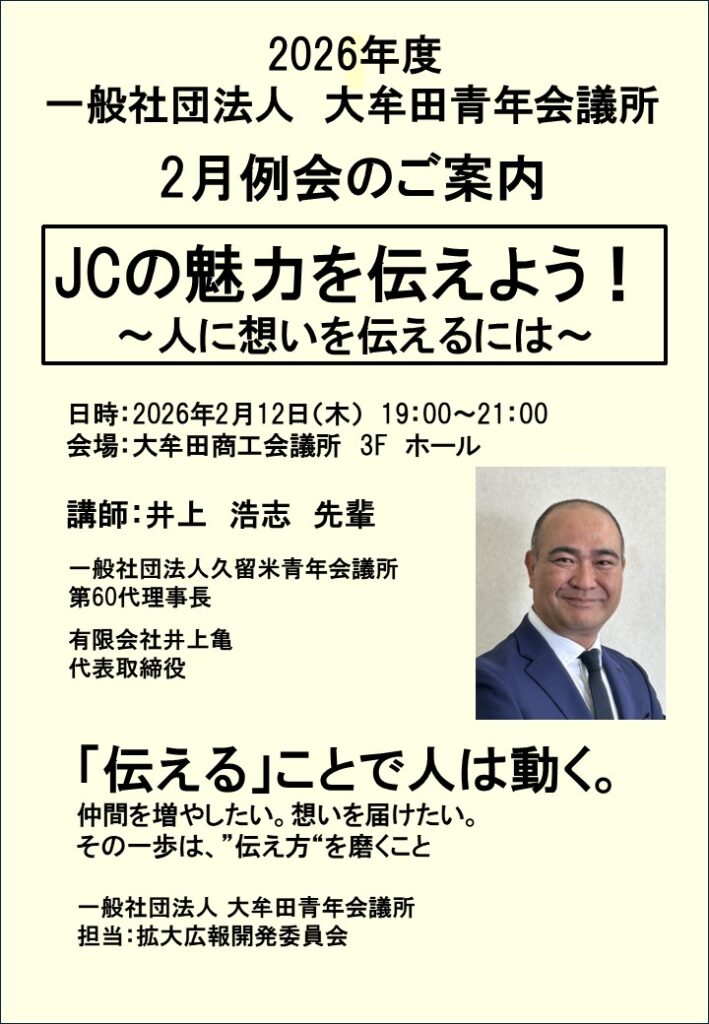 2月12日(木)19時~商工会議所3Fで本年度1回目の例会を開催致します。 久留米JC歴代理事長の井上浩志先輩をお招きし、「JCの魅力を伝えよう~人に想いを伝えるには~」というテーマで講演頂きます! 今年1回目の例会で100%例会を達成しましょう!