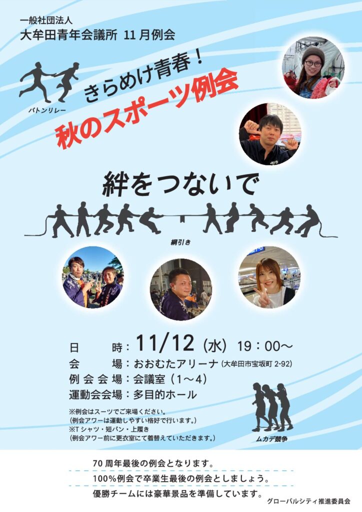 本年最後の例会になります11月例会は秋のスポーツ例会を開催いたします。 委員会対抗のチーム戦となっておりますので、皆さん是非ご参加よろしくお願いします。 日時:2025年11月12日(水)19時 場所:大牟田アリーナ