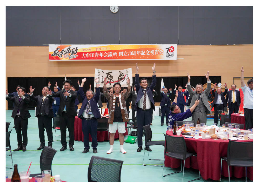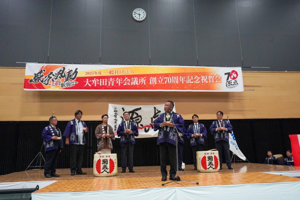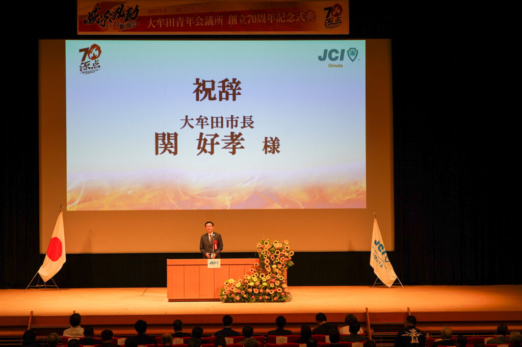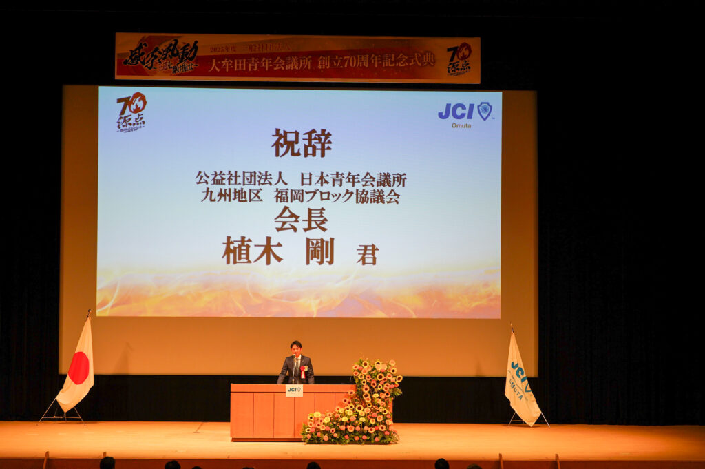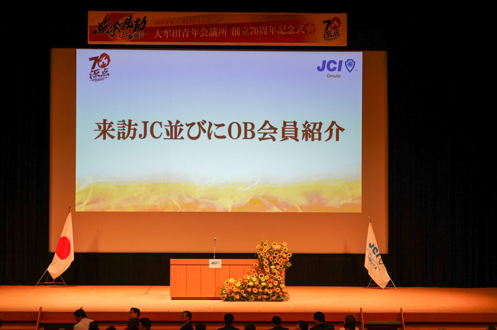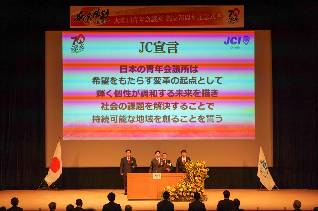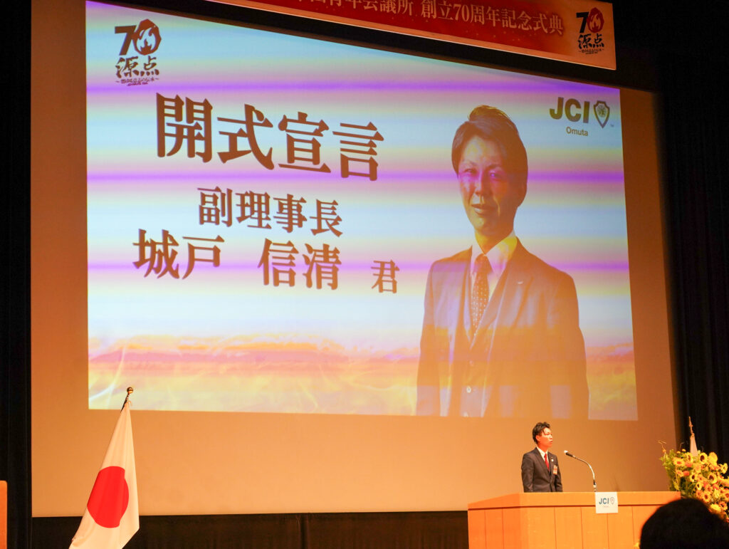 記念式典では、これまでの大牟田JCの軌跡を振り返る映像上映や、歴代理事長・来賓による祝辞を頂戴し、地域の発展に寄与してきた多くの魂の結集を改めて感じる時間となりました。続いて行われた祝賀会では、世代を超えた交流が生まれ、70周年を節目として、さらなる地域貢献への決意を互いに確かめ合う温かい場となりました。